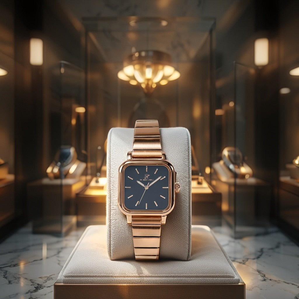 Wrapped in a soft gold casing with a striking black dial, its minimalist beauty speaks volumes in silence.